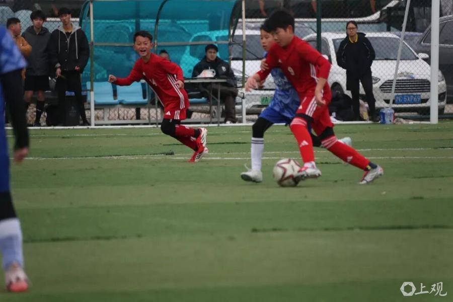 与此同时,两场 U9 组别比赛也激烈上演。上海申茂蓝队与浦东区东港小学的小球员们跑动积极,虽然年龄不大,但停球、传递有板有眼,展现了良好的青训基础。崇明区实验小学与 JFTC 梦幻队之间展开较量,比赛场面开放,双方你来我往,小个子球员的灵活与速度成为亮点,引得场边教练与家长阵阵喝彩。